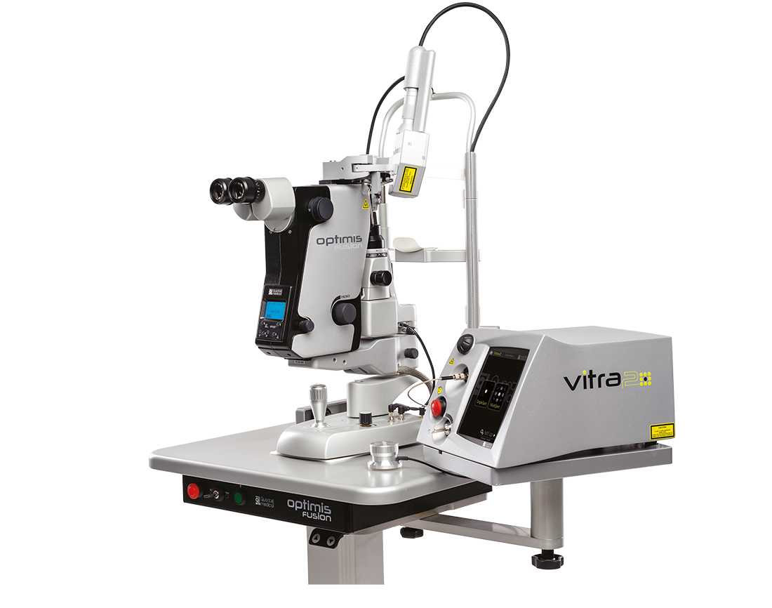The Optimis Fusion is a compact, dual‑mode SLT/YAG laser that combines nanosecond 1064 nm and 532 nm pulses from a single dual‑mode cavity to simplify design and boost reliability; engineered for precision capsulotomy, iridotomy and selective trabeculoplasty, it pairs premium slit‑lamp optics, a two‑point (twin‑dot) aiming system and motorized anterior/posterior offsets for fast, accurate targeting while minimizing collateral tissue effects and IOL pitting. Delivering high‑peak photodisruptive Nd:YAG pulses and gentle, repeatable SLT energy through a 400 µm homogeneous spot, the system supports both glaucoma and cataract procedures in a small footprint and is upgradable into a trio anterior/posterior treatment platform when combined with a compatible Quantel Medical retina laser (e.g., Vitra 2).